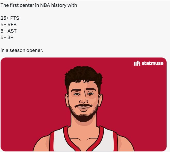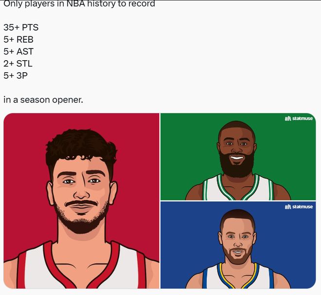 第四,申京是第三位能够在揭幕战中单场轰下至少35分5篮板5助攻2抢断外加5记三分球的球员,另外两人分别是库里和杰伦-布朗。
