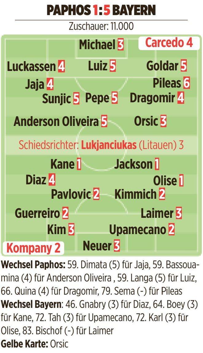 雷速体育10月1日讯 北京时间10月1日03:00,欧冠联赛阶段第二轮,拜仁慕尼黑客场5-1大胜帕福斯FC,本场比赛结束之后,德国媒体《图片报》为双方球员进行了评分。(注:德国媒体评分为1分最高,6分最低)